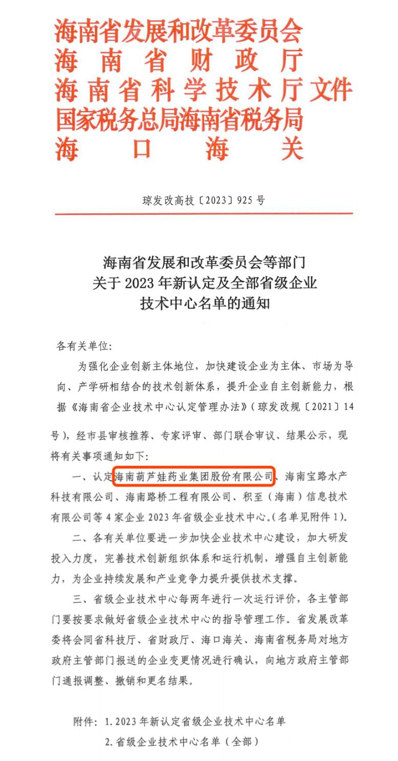 近日,海南省发改委等多部门联合公布了《关于2023年新认定及全部省级企业技术中心名单的通知》,其中,海南AG庄闲药业集团股份有限公司成功通过评审,被认定为省级企业技术中心,是本次获批的4家企业之一。
